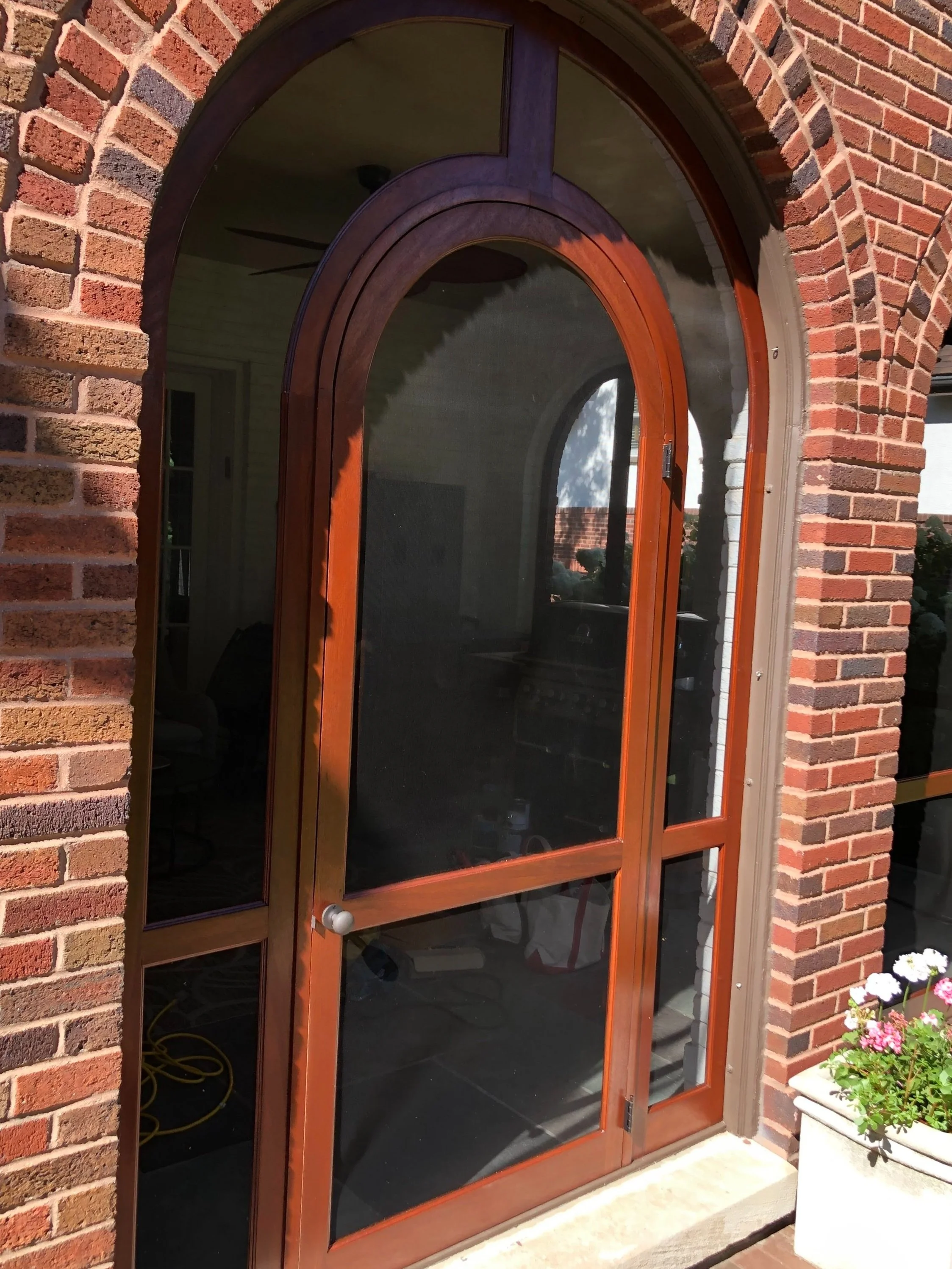 These homeowners hired me to craft exact replicas of arched screens that fit into brick archways of their three-season porch. The originals (three windows and one door) were aging and had been painted several times.
